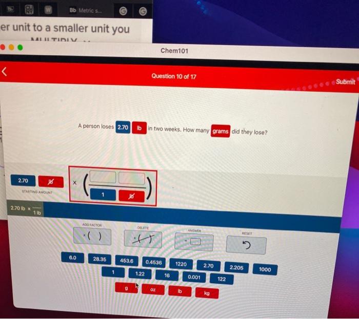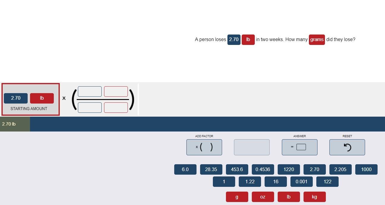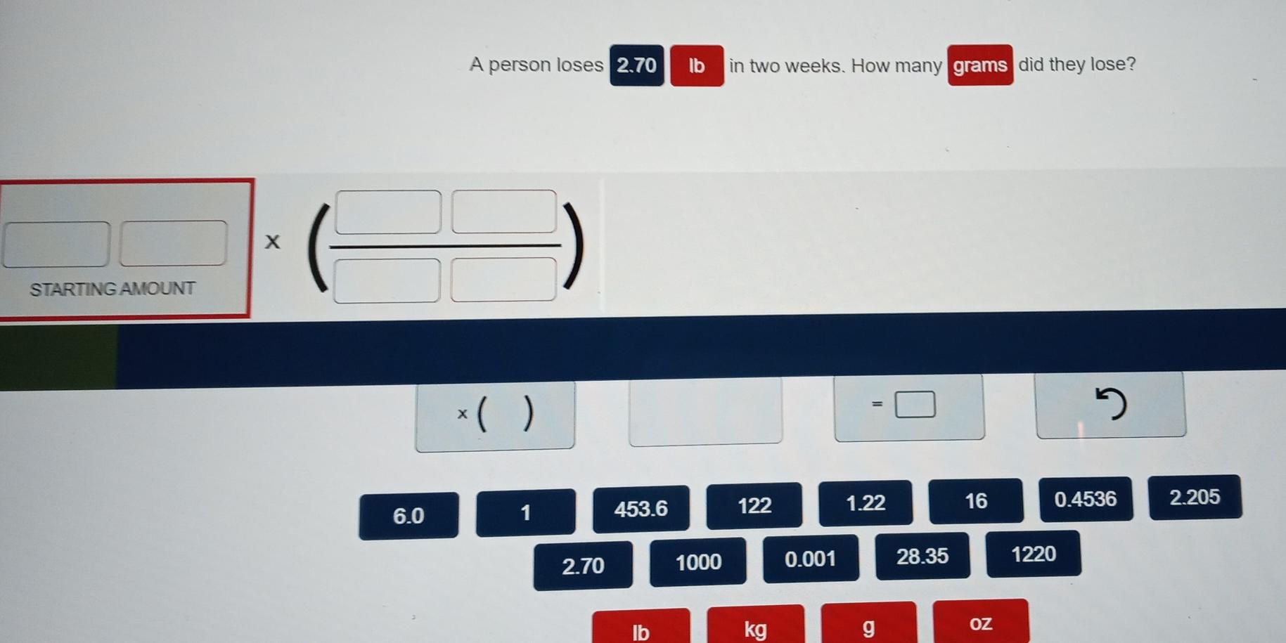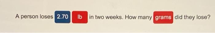 Solved A Person Loses 2 70 Two Weeks How Many Grams Did They Lose 2 70 Starting Amount 2701 Doeccf 404e 6 0 28 35 453 6 0 4536 1220 270 2 205 1000 1 22 0 001 122